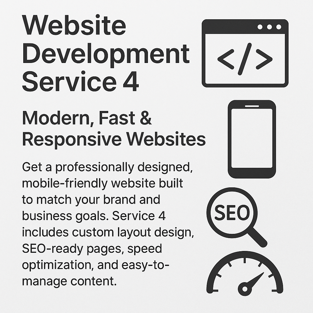 Get a professionally designed, mobile-friendly website built to match your brand and business goals. Service 4 includes custom layout design, SEO-ready pages, speed optimization, and easy-to-manage content. Perfect for businesses looking for a modern, secure, and high-performance website.